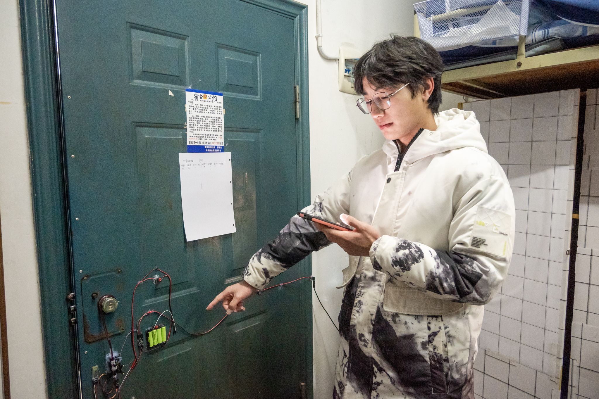 “我们可以把这个系统当成一个自行车来看。”杨宏广指着门后的电子元件介绍,蓝牙接收器相当于自行车踏板,用手机蓝牙连接后输入密码,就能踩动系统这个“自行车”,让舵机旋转,舵机上缠绕的轴绳像链条带动最后的‘车轮’一般,使门把手旋转,从而打开房门。