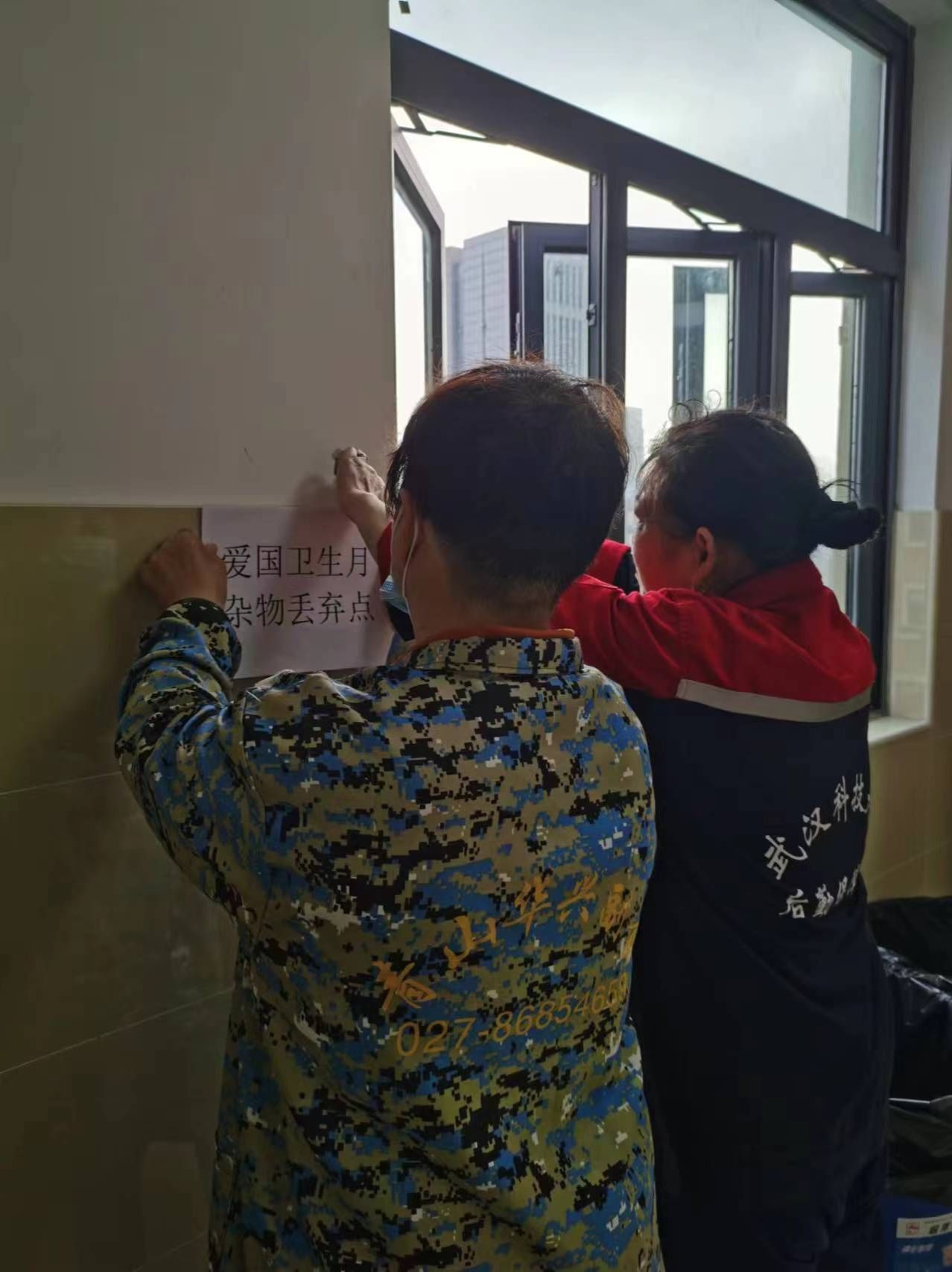 青山物业服务中心在宿舍楼放置爱国卫生月宣传牌,张贴海报。学工部和研工部组织学生骨干,动员青山校区全体学子,配合物业工作人员共同创造干净整洁、和谐有序的宜人宜学宜居环境。
