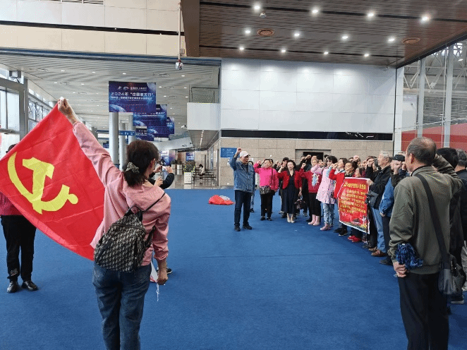 在车上,陈文峰老师讲述航天人艰苦奋斗、勇于创新的精彩故事,赢得大家热烈的掌声。进入武汉国博中心,党员们在展览馆大厅里,面对党旗,在领誓人陈文峰的带领下重温入党誓词。