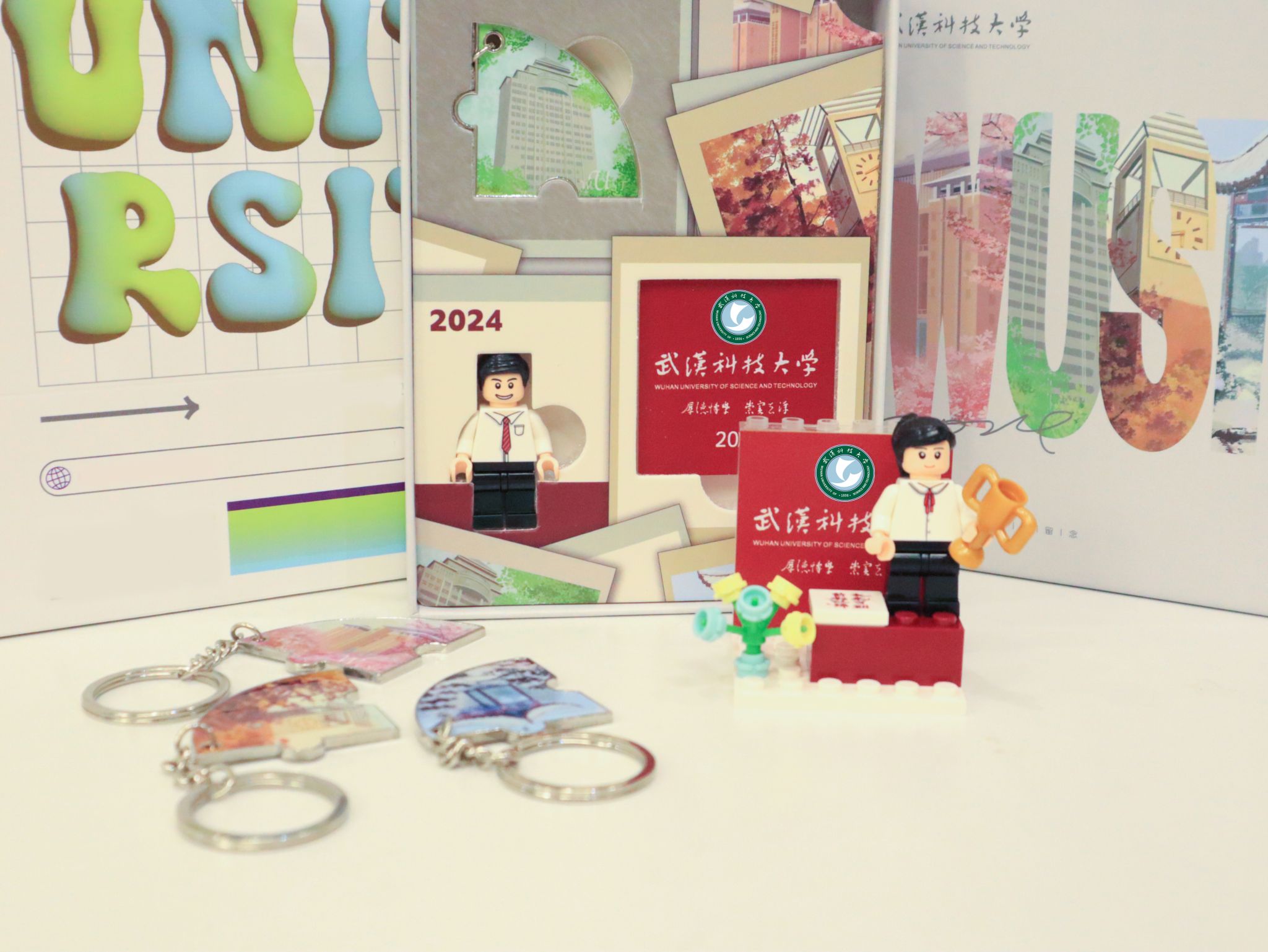 毕业纪念品包含定制礼盒、钥匙挂件、积木;采用黄家湖校区恒大楼、青山校区主楼为主题,同时结合沁湖四季美景作为设计元素。钥匙扣镌刻有春樱”“夏叶”“秋枫”“冬雪”四种景色,共有四种样式,并且每份背后刻有每位学生姓名和学号。积木小人的背景板上刻有“厚德博学,崇实去浮”的校训,积木小人则站在背景板前,手捧鲜花和奖杯。
