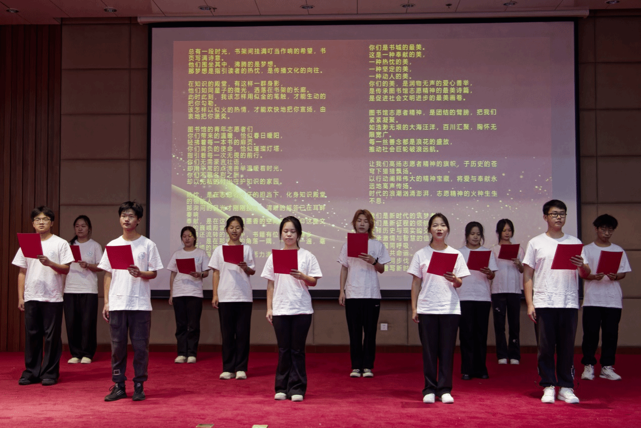 优秀志愿者代表周佳颖的发言中谈道:“志愿服务不仅是奉献,更是成长,每一次参与都是对自己的历练和提升。”青鸟朗读队以饱满的热情朗诵了《志愿者赞礼》,当“图书馆志愿者精神,是团结的臂膀,把我们紧紧凝聚”的自信豪迈之声在会堂飘扬时,立刻获得观众的热烈掌声。